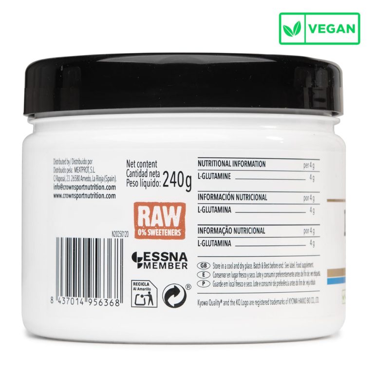 L-Glutamina Kyowa® de Crown Sport Nutrition es glutamina en polvo de máxima pureza, elaborada con materia prima Kyowa® Quality, el estándar más exigente del mercado. Refuerza el sistema inmunológico, favorece la recuperación muscular y optimiza la absorción de nutrientes tras sesiones intensas de entrenamiento. Con certificación antidopaje Informed Sport, sin gluten, sin lactosa y apta para veganos.