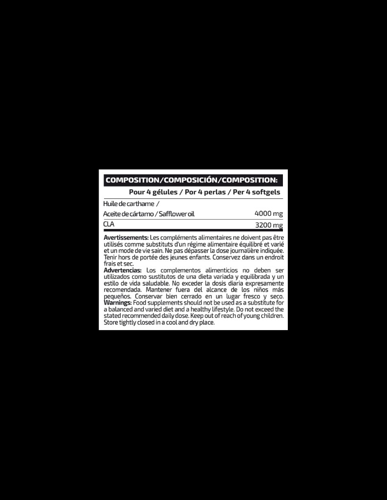 Aceite de cártamo (Carthamus tinctorius L., grano, 80% CLA), agentes de recubrimiento (gelatina*, glicerina *y agua*).