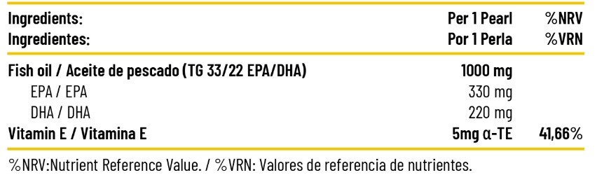 Aceite de pescado TG 33/22 EPA/DHA IFOS, gelatina bovina*, humectante (glicerina)*, agua* y vitamina E (acetato de DL-alfa-tocoferilo) *: Componentes de la cápsula de gelatina blanda.