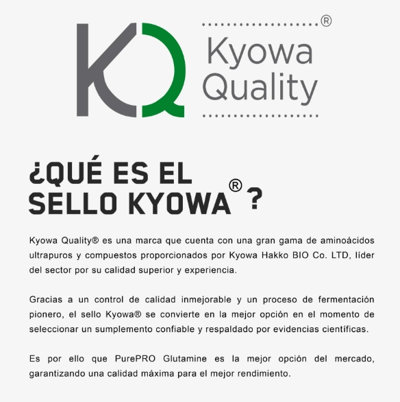La Glutamina Kyowa® es L-glutamina de alta pureza y calidad certificada por la empresa japonesa KYOWA HAKKO BIO CO., LTD.. Este aminoácido no esencial, el más abundante en el músculo y la sangre, se produce mediante fermentación vegetal, es 100% vegano y libre de alérgenos. Se usa en suplementos deportivos para apoyar el crecimiento muscular, mejorar la recuperación tras el ejercicio, fortalecer el sistema inmunológico y la salud intestinal.