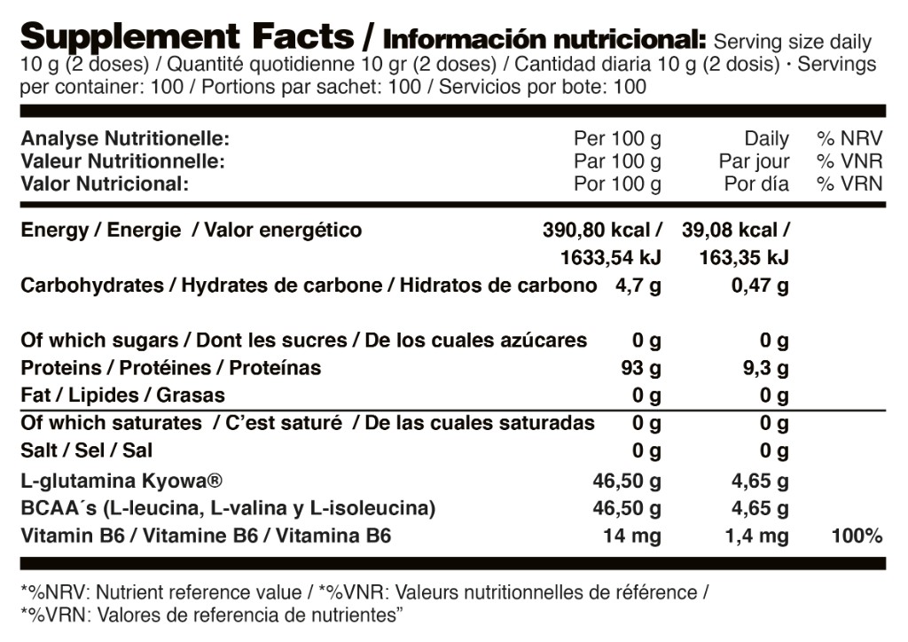 Una fórmula exclusiva de creada en 2007- 2008, diseñada específicamente para favorecer la recuperación muscular. Esta combinación única de BCAAs en proporción 2:1:1 y L-Glutamina de alta calidad con patente KYOWA® es ideal para incrementar la síntesis de proteínas, mejorar la retención de nitrógeno y frenar el catabolismo muscular causado por el entrenamiento intenso y refuerza el sistema inmune.