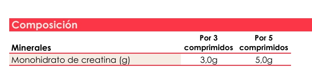 Monohidrato de creatina (Creapure®), agente de carga (celulosa microcristalina), establizante (fosfato de calcio), antiaglomerante (estearato de magnesio)