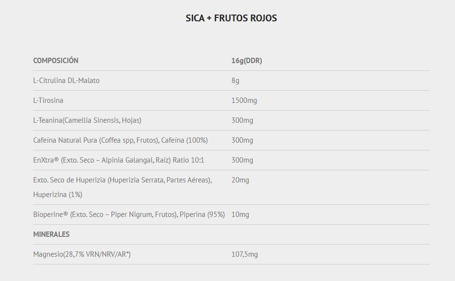 - SICA+ está compuesto por materias primas patentadas de la mayor calidad como Enxtra® (raíz de Alpinia Galangal), con efectos sobre el estado de alerta y la agudeza mental, que actúa en sinergia con una elevada dosis de cafeína de liberación sostenida (300 mg por servicio) aumentando la eficacia de esta sobre el sistema nerviosos central.