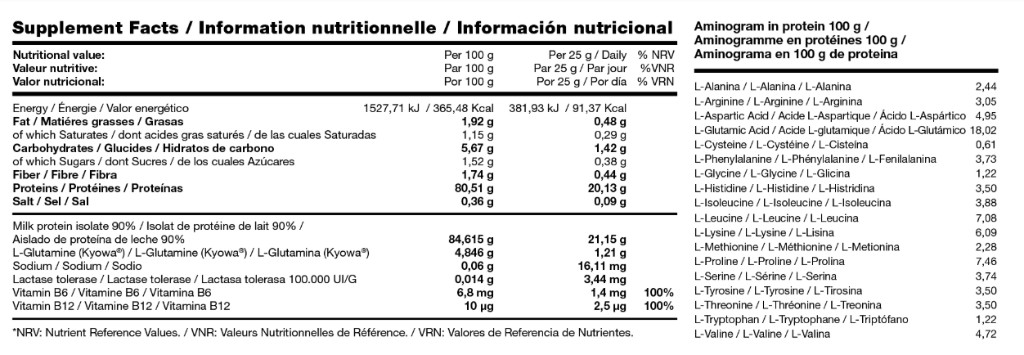 Aislado de proteína de leche (MPI): Contiene un 80% de caseína y un 20% de suero, con un 90% de contenido proteico, sin lactosa ni grasas.