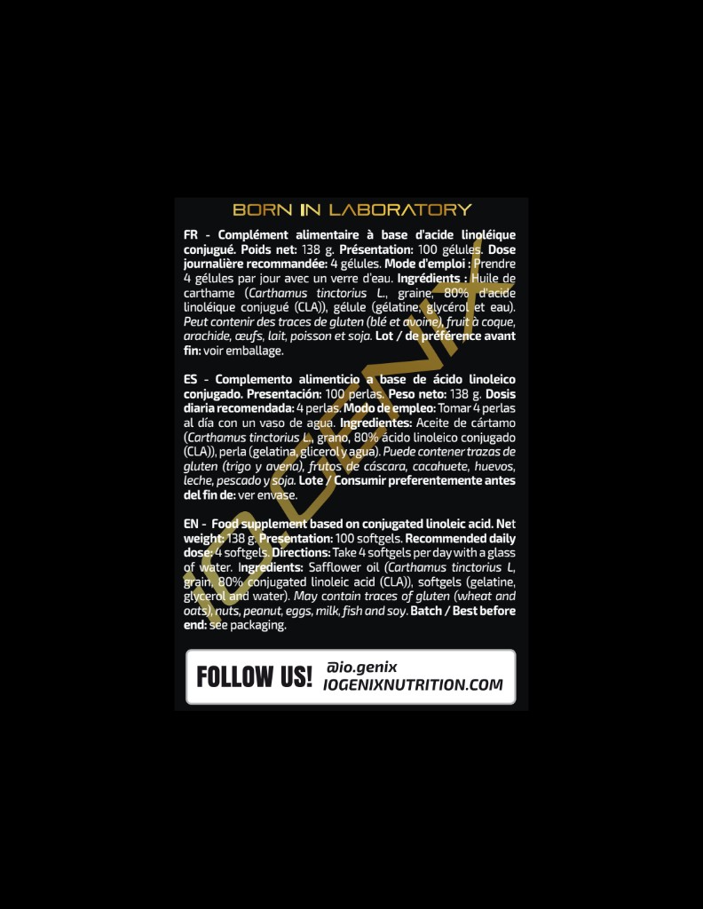 Este suplemento de CLA se caracteriza por ser totalmente natural pudiendo ser ingerido por todas aquellas personas que necesiten una ayuda extra para cumplir todos sus objetivos. Además, el formato en el que lo fabricamos son perlas, siendo muy fáciles de ingerir junto a un vaso de agua.